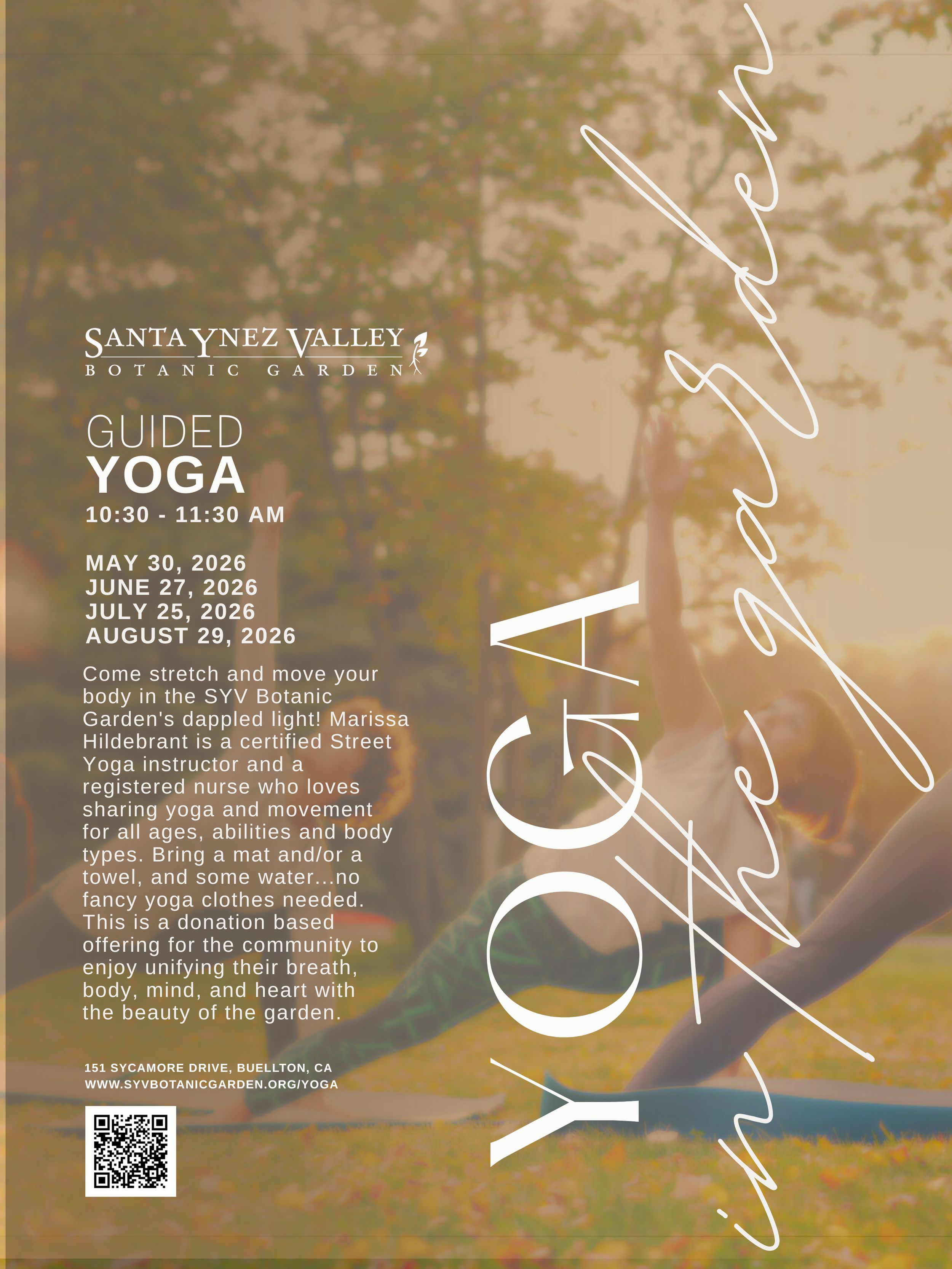 Come stretch and move your body in the SYV Botanic Garden's dappled light! Marissa Hildebrant is a certified Street Yoga instructor and a registered nurse who loves sharing yoga and movement for all ages, abilities and body types. Bring a mat and/or a towel, and some water...no fancy yoga clothes needed. This is a donation based offering for the community to enjoy unifying their breath, body, mind, and heart with the beauty of the garden..